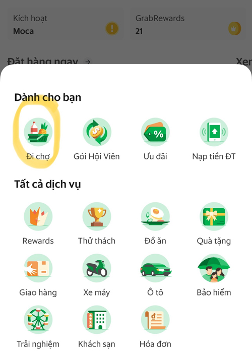 Trong giao diện của Grab, hãy nhấn vào ô Tất Cả, Sau đó nhấn vào mục: Đi Chợ.
