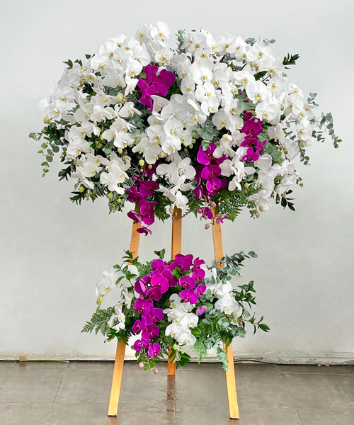 Mẫu hoa chia buồn cao cấp được thiết kế tỉ mỉ, kết hợp hài hòa giữa vẻ đẹp kiêu sa của các loài hoa như lan hồ điệp, lan thái trắng, hoa hồng trắng, hoa lily, và những đóa cúc mẫu đơn trắng trang nghiêm. Mỗi loài hoa được chọn lọc kỹ lưỡng, không chỉ về màu sắc mà còn về hình dạng và ý nghĩa, để đảm bảo rằng chúng tạo nên một lẵng hoa đại diện cho sự thanh cao và tinh tế.