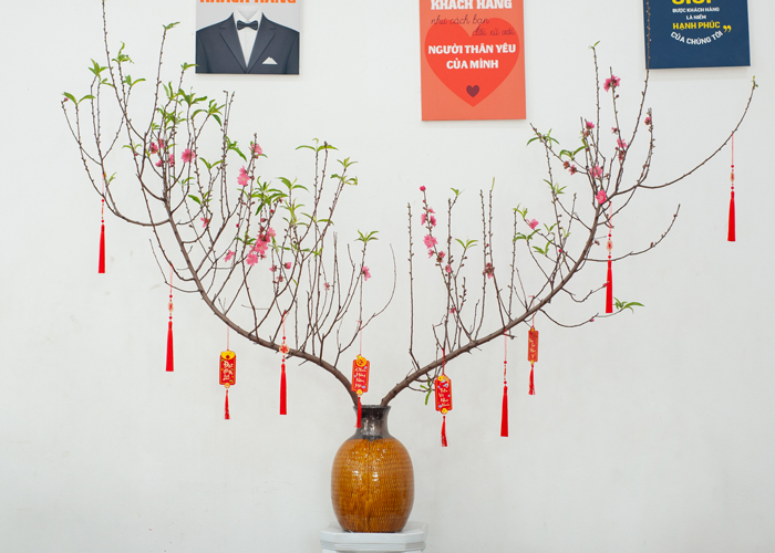 Hoa tết thì mình sẽ trang trí vài cành Đào Nhật Tân - Hà Nội : hoa nở rộ đầy sức sống với 2 tone màu hồng xác pháo và hồng đào phai sẽ thu hút ánh nhìn với sắc hồng mộng mơ. Ngoài ra Tuyết Mai cũng là sự kết hợp độc đáo để trưng bày trong dịp tết này, hoa tượng trưng cho sự sinh sôi nảy nở, phát lộc và mang lại sự may mắn cho mọi người, tạo nên một bầu không gian phù hợp với mùa đón chào năm mới.