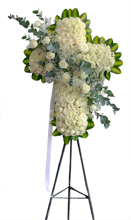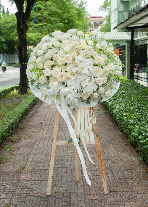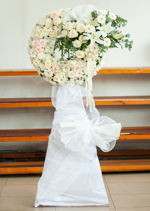 b. Đối với Đạo Thiên Chúa: Ngoài việc chọn hoa theo các hình dáng thánh giá thì các kệ hoa tang thường đi theo tông trắng, trắng tím, cắm dạng đứng hoặc dạng tròn và có thiết kế phối hợp hài hòa và sang trọng.