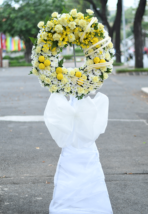 Kệ hoa sử dụng theo tone trắng - vàng dùng hoa cẩm chướng vàng, cúc pingpong vàng phối với hoa lan vũ nữ và cúc tang trắng rất hài hòa và tươi sáng giúp người nhận giảm bớt đi sự u buồn trong ngày tang lễ.