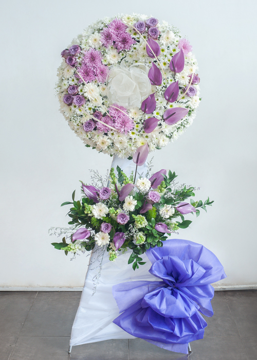 Dùng tone trắng - tím hoặc trắng - xanh lá phối hợp hoa môn tím, cúc tím và đồng tiền trắng hồng trắng hay sử dụng môn xanh, cúc xanh phối hoa hồng ohara trắng và lys trắng mong người ở lại cũng đừng quá đau lòng, tiếp tục hướng về tương lai phía trước.