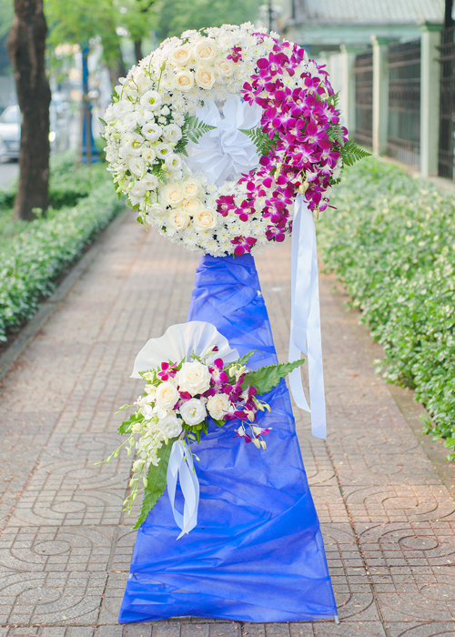 Kệ hoa dùng lan vườn tím, lan thái trắng cùng với hoa cát tường trắng, cúc trắng như gửi gắm những lời động viên, chia sẻ của bản thân đến gia đình người nhận.