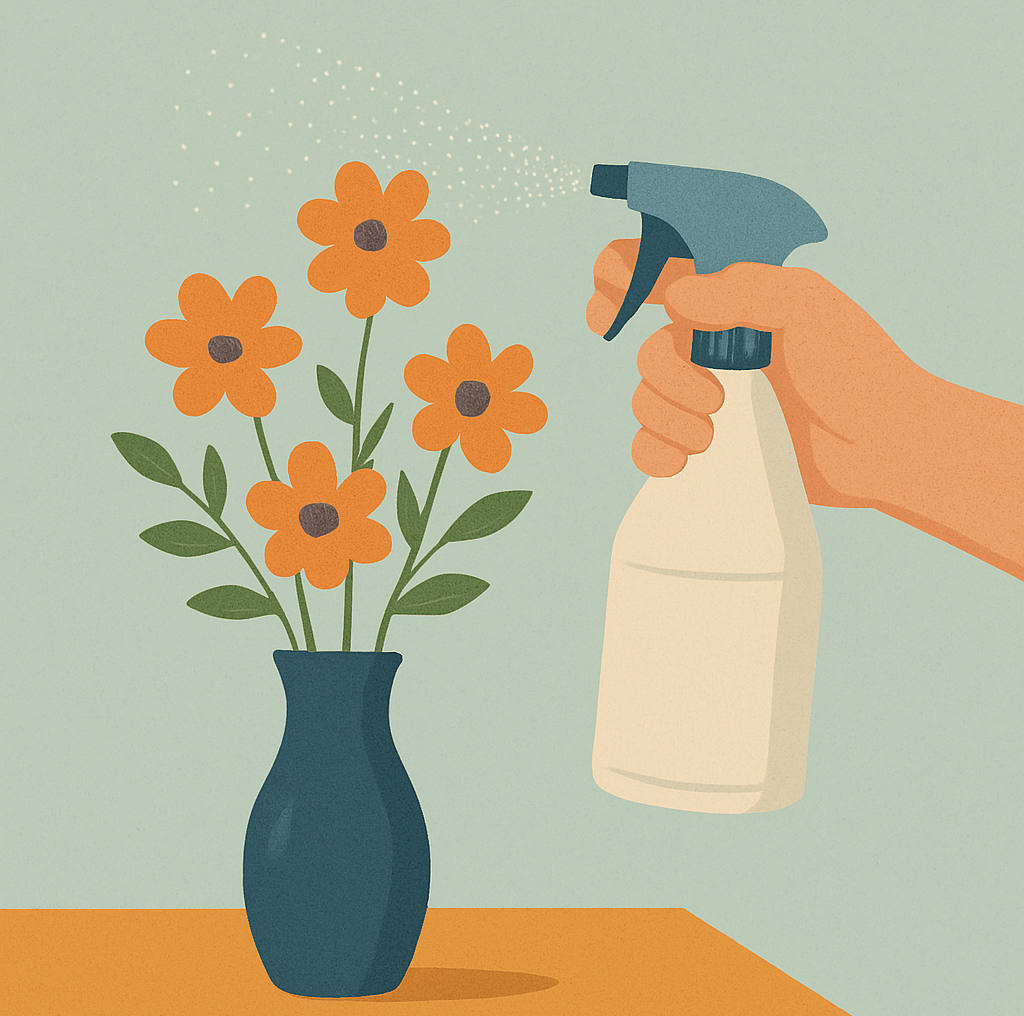 Trong môi trường điều hòa, độ ẩm thường thấp khiến hoa dễ bị mất nước và nhanh héo. Để duy trì độ ẩm cho hoa, bạn nên xịt sương nhẹ lên cánh hoa mỗi ngày, lưu ý tránh xịt trực tiếp vào nhụy để không làm hư hoa.