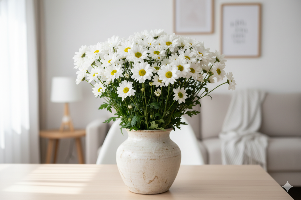 Sử dụng bình gốm hoặc lọ sành, cắm một bó hoa cúc đồng nhất một màu vàng hoặc trắng thật sum suê. Cách cắm này tạo cảm giác ấm cúng, gần gũi với không gian gia đình.