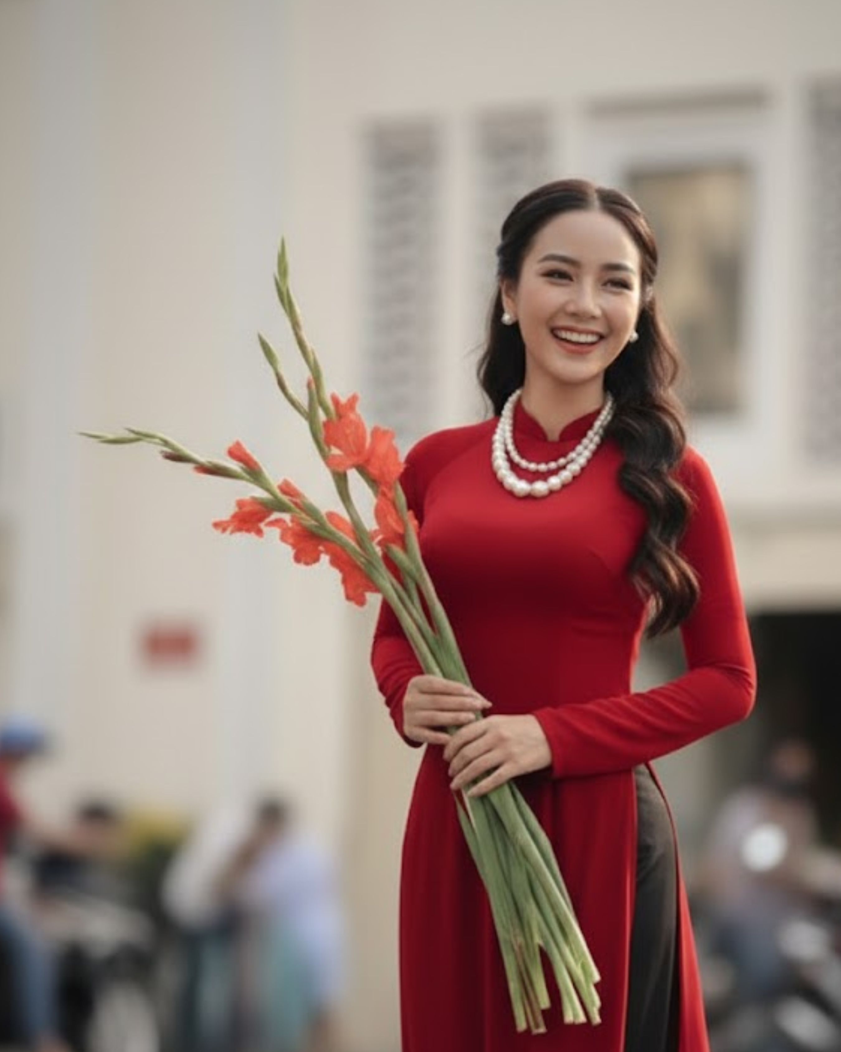 Phối cùng áo dài: Loại hoa này đặc biệt thích hợp với áo dài dáng suông (form rộng) hoặc áo dài cô ba Sài Gòn. Những gam màu như đỏ, hồng phấn của hoa Lay Ơn sẽ làm bừng sáng cả khung hình.