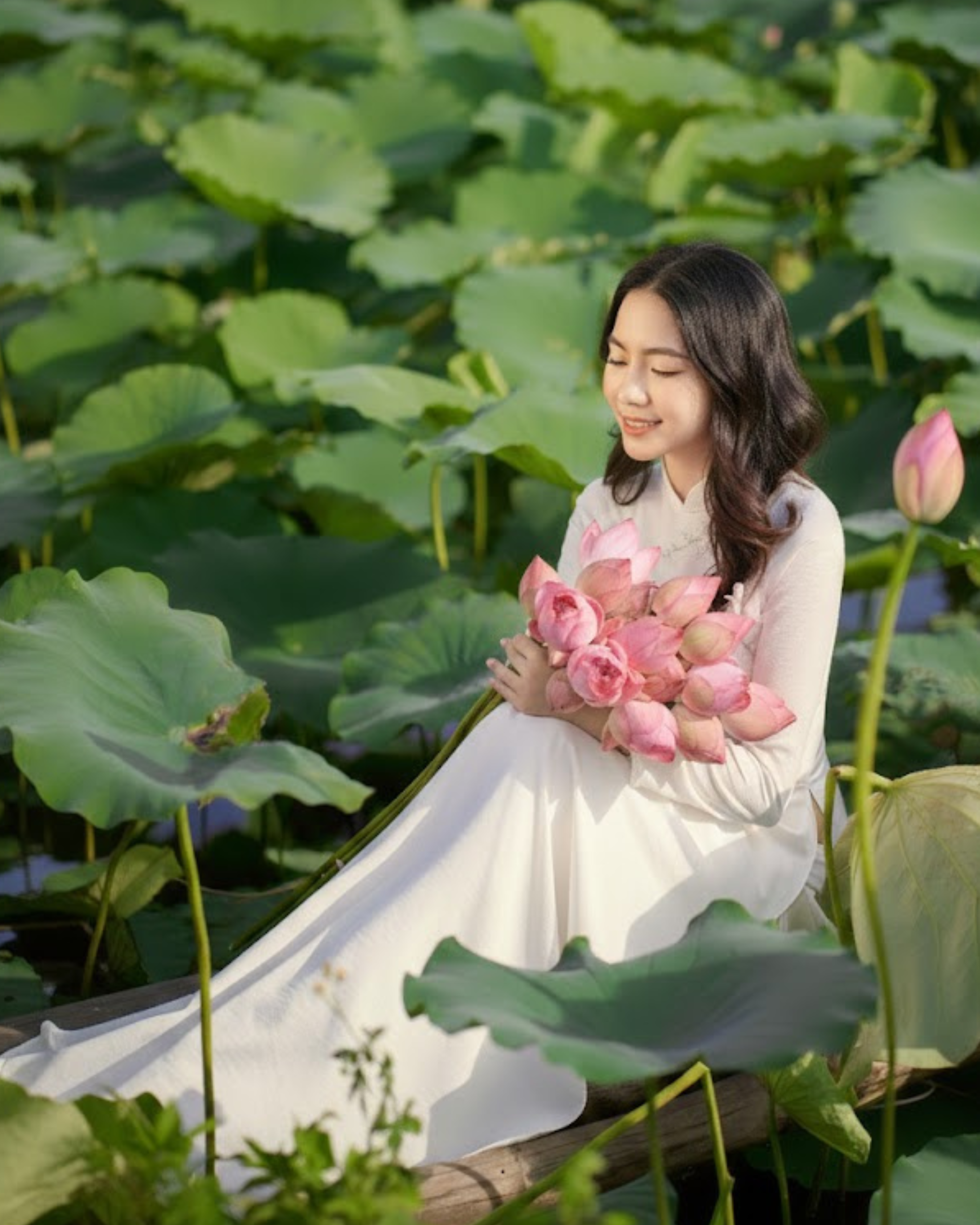 Phối cùng áo dài: Áo dài trắng truyền thống kết hợp với sen hồng chính là "bộ đôi huyền thoại". Ngoài ra, áo dài màu nâu sồng, mỡ gà hoặc các tông màu trầm cũng rất hợp để tạo nên bộ ảnh mang hơi hướng Phật giáo hoặc thiền định.