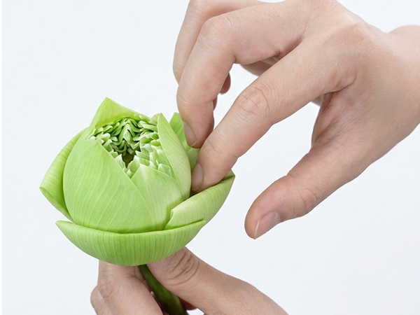 Sử dụng lực cực nhẹ từ đầu ngón tay cái để miết nhẹ và đẩy cánh hoa ra phía ngoài. Thao tác cần sự mềm mại và uyển chuyển để cánh hoa tách rời khỏi khối búp mà không làm rách gốc cánh hoặc làm nát bề mặt mỏng manh của hoa.