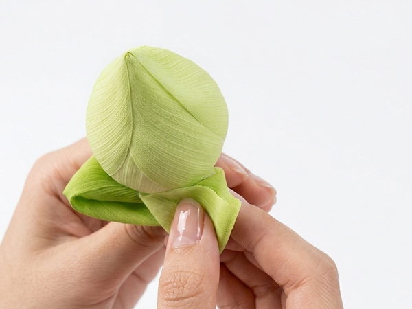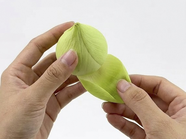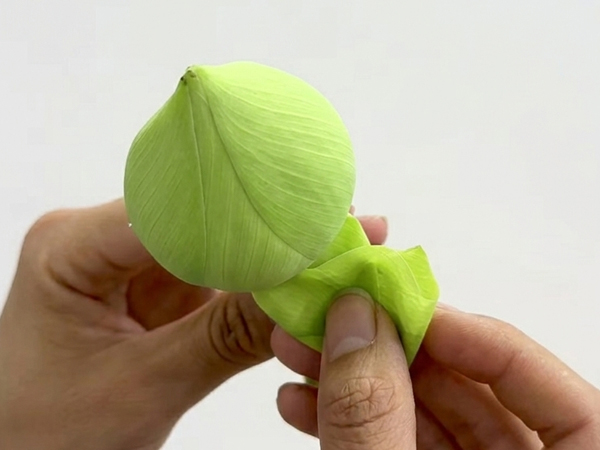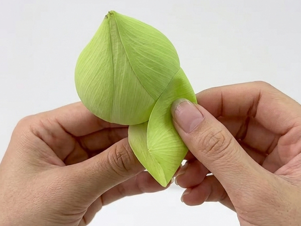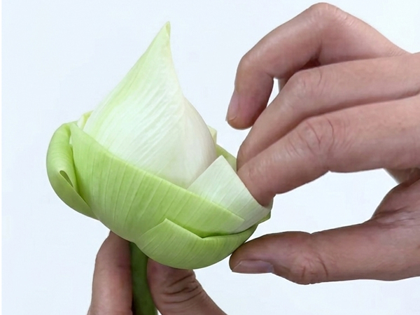 Sử dụng ngón tay trỏ đè nhẹ phần đỉnh nhọn của cánh hoa xuống phía dưới, ngược vào trong, cánh hoa sẽ tạo thành một đường ngang ở phía trên, tạo ra cấu trúc hình thang cân đối.
