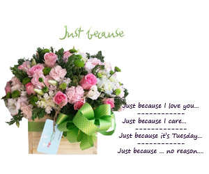 Tôi có một cô bạn, và cô ấy thật may mắn khi mới tuần trước thôi đã nhận được một hộp hoa dễ thương tại nơi làm việc. Thật ngại khi phải nói rằng tôi đã có chút ghen tỵ với cô ấy, và có lẽ, những người phụ nữ khác trong văn phòng cũng vậy, nhưng, chỉ một chút thôi, dù sao, tất cả chúng tôi cũng mừng cho cô ấy, vì món quà được gửi đến chẳng vì bất kỳ một lý do gì đặc biệt. Hôm nay không phải ngày lễ, cũng chẳng phải sinh nhật, và tất nhiên, như cô ấy nói- cũng chẳng phải một ngày kỉ niệm đặc biệt gì giữa hai người. Gửi kèm theo hoa ấy là một tấm thiệp với những lời nhắc nhở ngọt ngào từ chàng trai của cô - cho một ngày bình thường. Và, trong suốt thời gian còn lại của ngày, dường như tất cả các cuộc hội thoại tại văn phòng giữa những người phụ nữ chúng tôi chỉ xoay quanh chủ đề về món quà hôm nay của cô ấy.Giống như tôi đã đề cập bên trên, điều bất ngờ và ngọt ngào từ những bó hoa “Just Because” khiến cho người phụ nữ cảm thấy hạnh phúc và vui vẻ hơn hẳn, nhất là khi có rất nhiều người xung quanh ngưỡng mộ và nói rằng cô ấy thật may mắn khi có một chàng trai tuyệt vời như vậy, và hộp hoa kì diệu hôm nay quả thật là một điều đặc biệt.