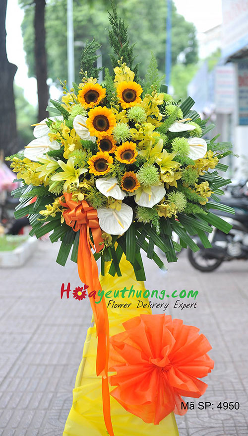 Hoa hướng dương: Hoa hướng dương ấm áp, may mắn và mạnh mẽ đối đầu với mặt trời. Tặng hoa hướng dương ngày khai trương mang ngụ ý rằng người được nhận sẽ luôn vượt qua mọi trở ngại trên con đường kinh doanh phía trước.