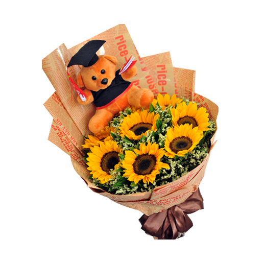 Theo xu hướng gần đây, các chú gấu bông tốt nghiệp đội nón và mặc áo cử nhân vô cùng đáng yêu thường là lựa chọn để làm quà tặng kèm với các bó hướng dương như một vật lưu niệm ý nghĩa. Khác với những bó hoa rồi sẽ tàn đi, những chú gấu dễ thương này sẽ như một minh chứng, một nhắc nhở về những lời chúc mừng, sự kỳ vọng gửi gắm của bạn bè người thân trong ngày trưởng thành này.