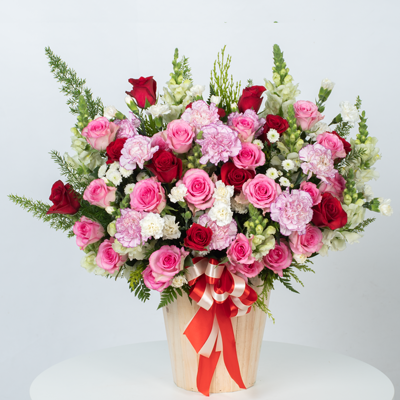 Bình hoa là sự kết hợp đơn giản nhưng mang đến gam màu hài hoà và nhẹ nhàng của hồng đỏ ớt, hồng trứng gà, cẩm chướng và các bông cúc rossi xinh xắn. Giỏ hoa phù hợp tặng các dịp chúc mừng, chúc sức khoẻ, hay chỉ đơn giản là món quà tặng để giúp ai đó có một ngày làm việc tràn đầy năng lượng mỗi khi ngắm nhìn bình hoa.