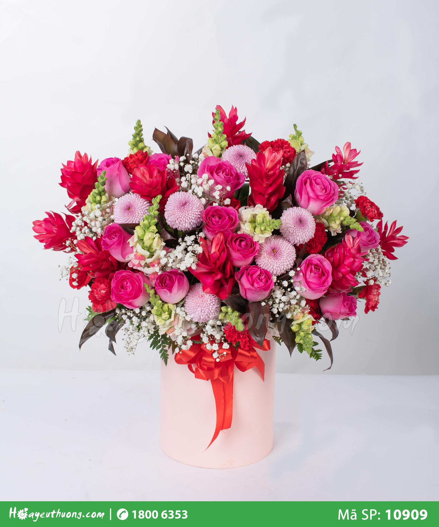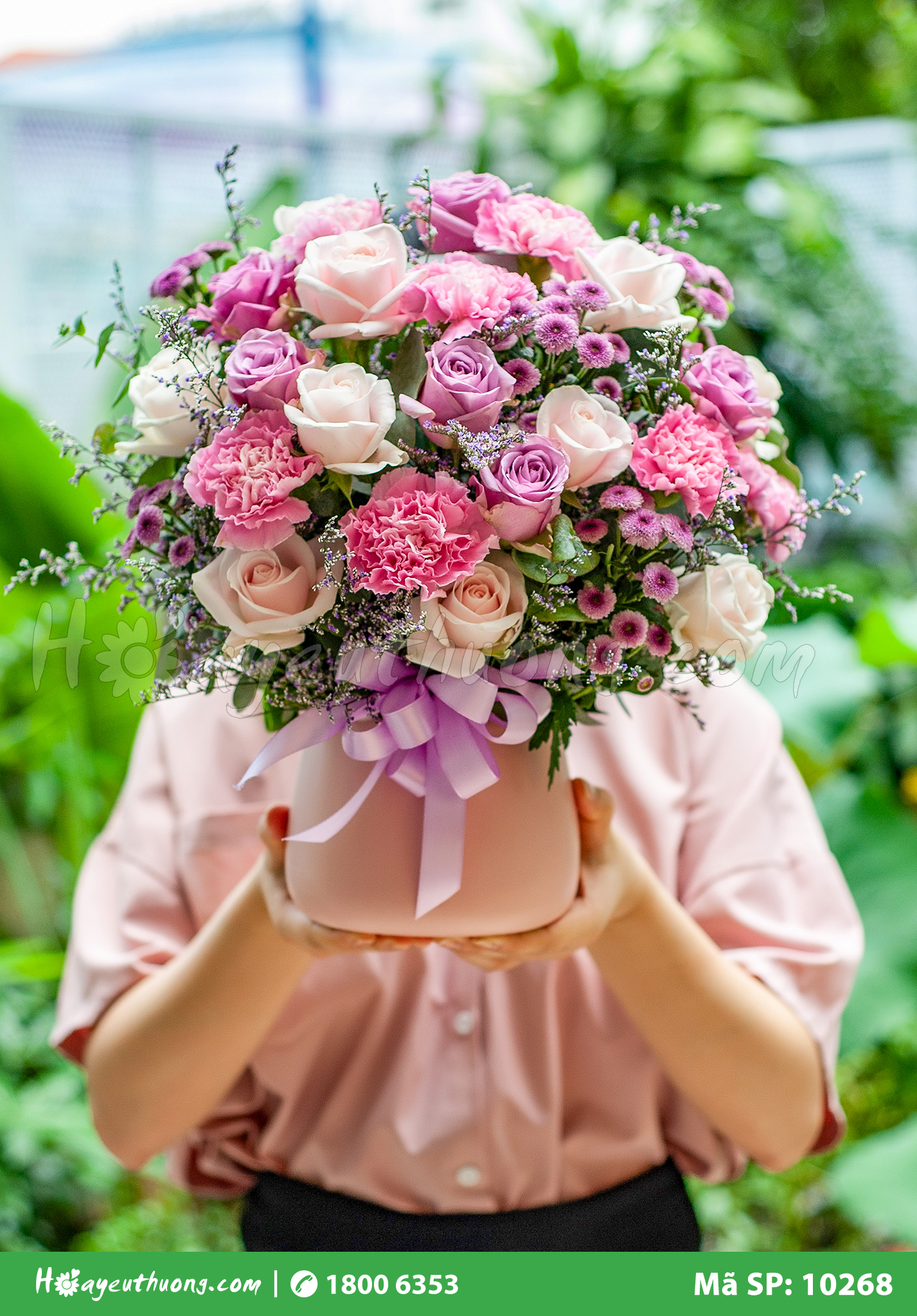 Hộp hoa bao gồm: 18 Hồng sen mới, 11 Hồng đỏ sa, 10 Mõm sói trắng, 5 Cẩm chướng chùm trắng, 2 Cúc calimero trắng, 10 Cẩm chướng đơn viền tím