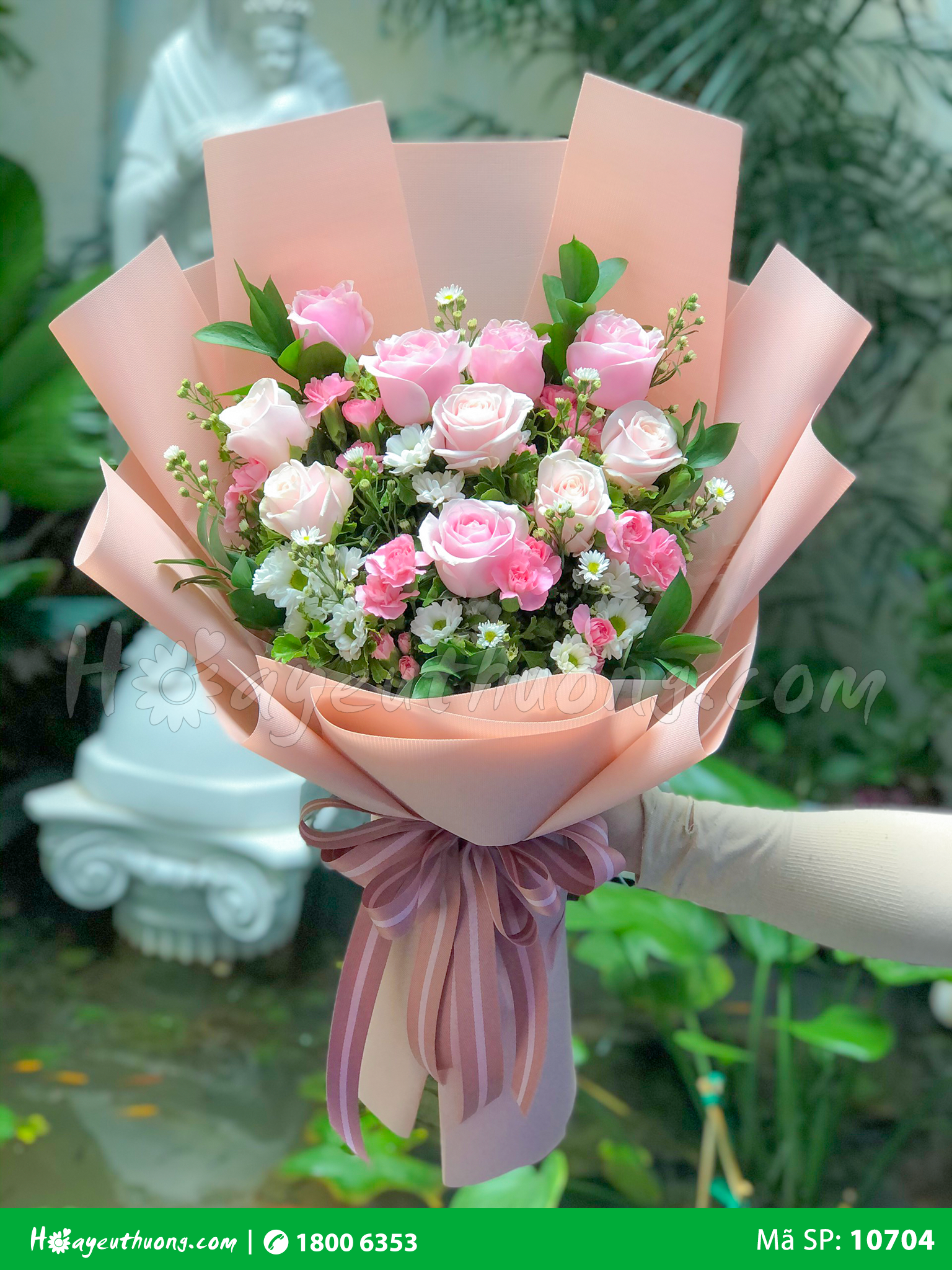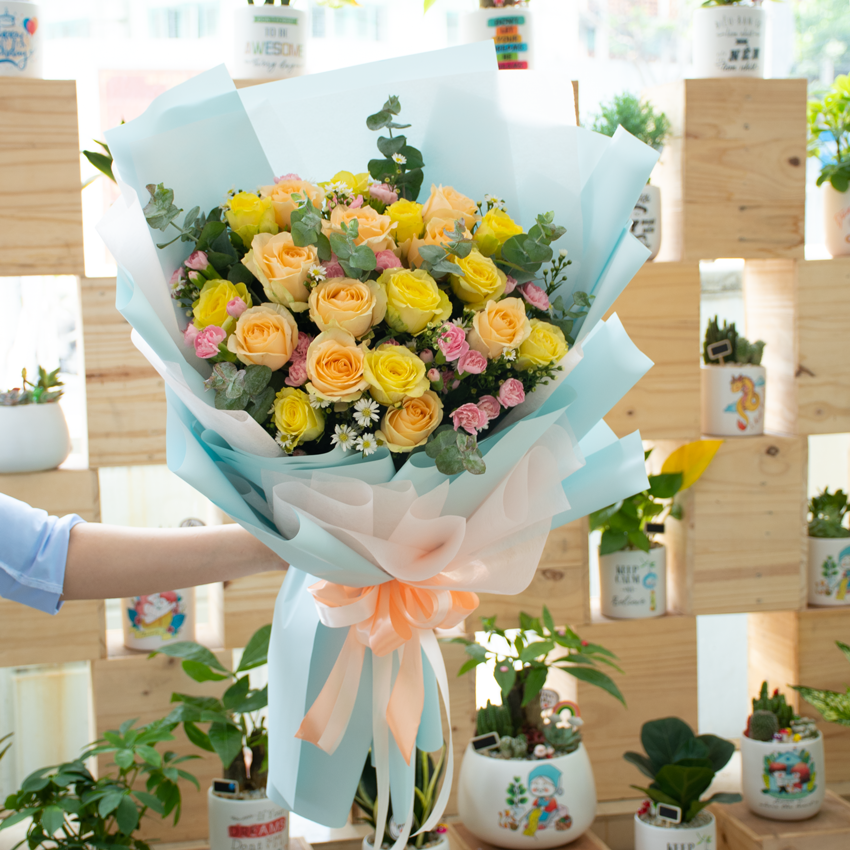 Bó hoa bao gồm: 10 Hồng trứng gà, 12 Hồng vàng ánh trăng, 5 Cẩm chướng chùm hồng nhạt, 2 Hoa thạch thảo trắng