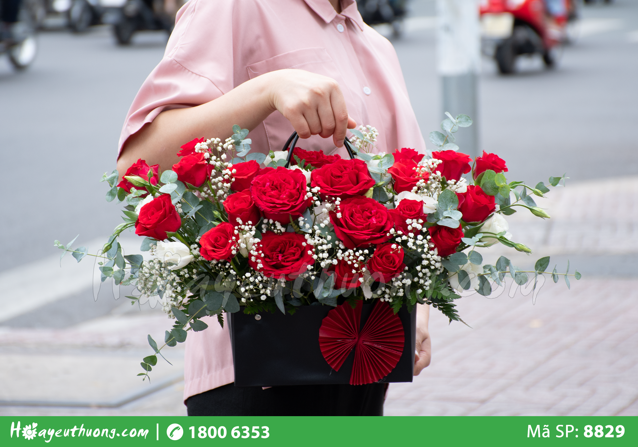 Bó hoa được thiết kế với tông màu đỏ nóng bỏng là biểu tượng cho một tình yêu mãnh liệt, tình cảm chân thành, lãng mạn, sẵn sàng bùng cháy và mang thông thông điệp: “I love you” . Hãy tạo bất ngờ cho người bạn yêu thương trong những dịp kỷ niệm nhé, chắn chắn nàng sẽ cảm nhận được tình yêu chân thành mà bạn dành cho nàng đấy.