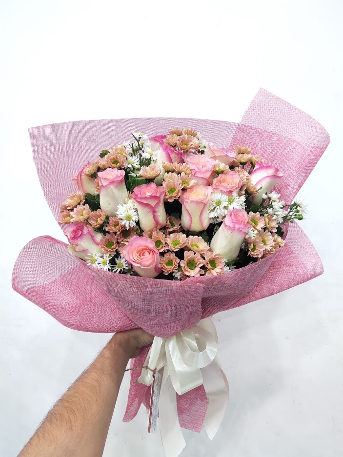 Bó hoa gồm có: 5 Hồng da, 5 Hồng da cồ, 5 Cẩm chướng chùm hồng nhạt, 5 Cúc rossi trắng