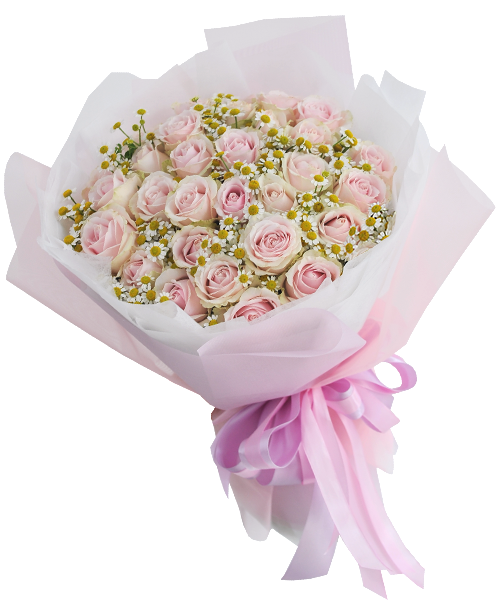 Bó hoa tươi Pink Light gồm các loại hoa: 30 Hồng da cồ, 5 Cúc Tana