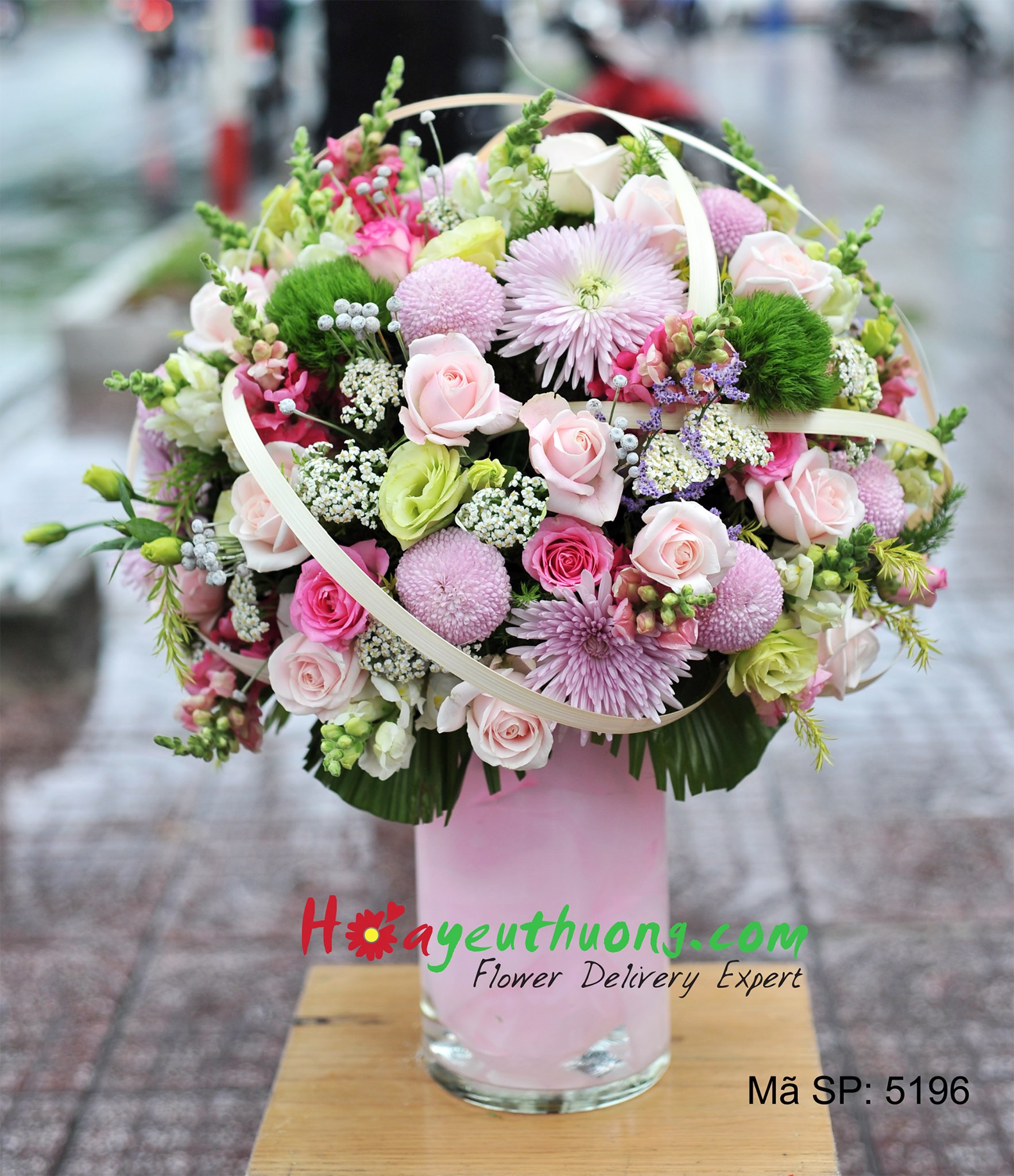 Bình hoa gồm có: 15 Hồng sen mới, 20 Hồng da, 15 Hồng da cồ, 7 Cát tường hồng viền, 8 Cúc Tana