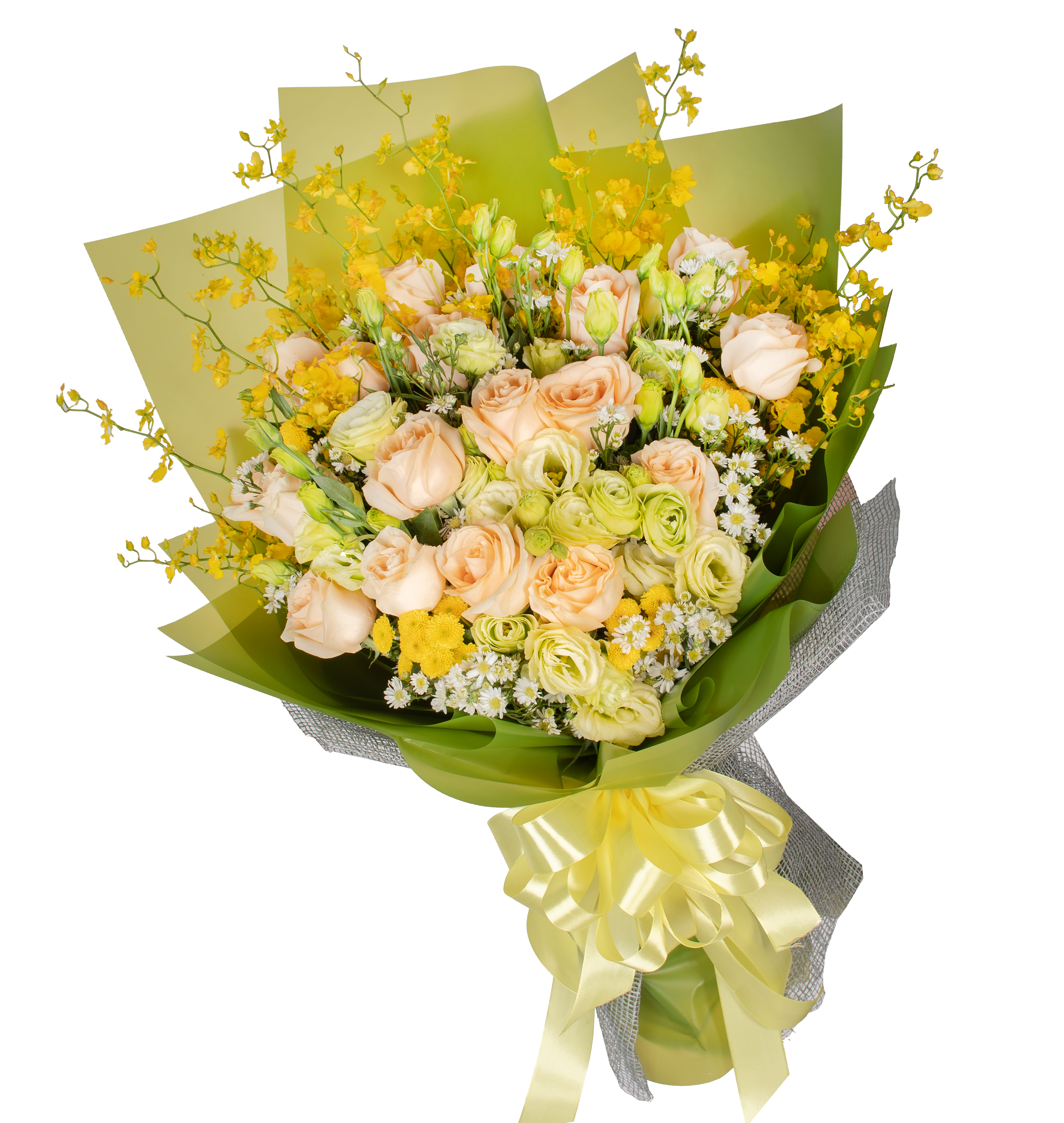 Bó hoa gồm các loại hoa tươi:16 Hồng trứng gà, 5 Cát tường xanh, 8 Lan vũ nữ, 5 Cúc calimero vàng, 5 Hoa thạch thảo trắng -