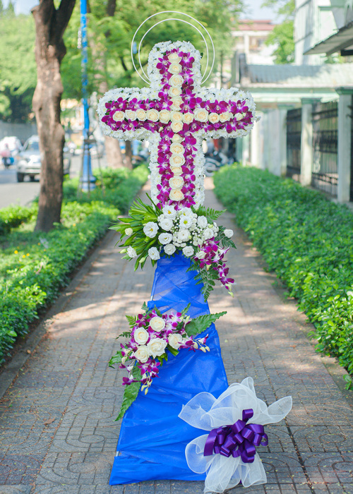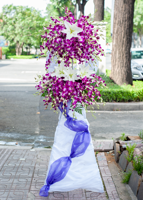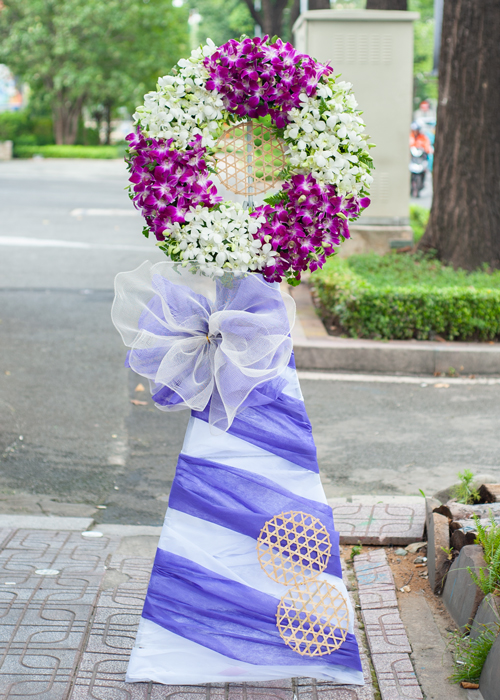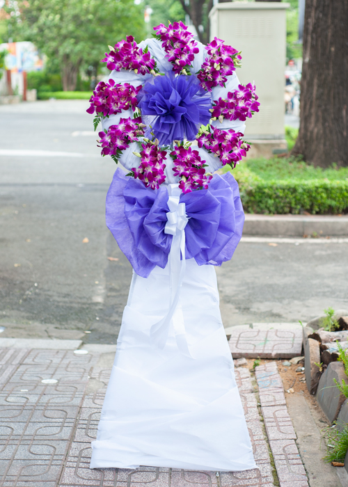 Dưới đây là một số mẫu thiết kế kệ hoa chia buồn sử dụng lan thái tím: