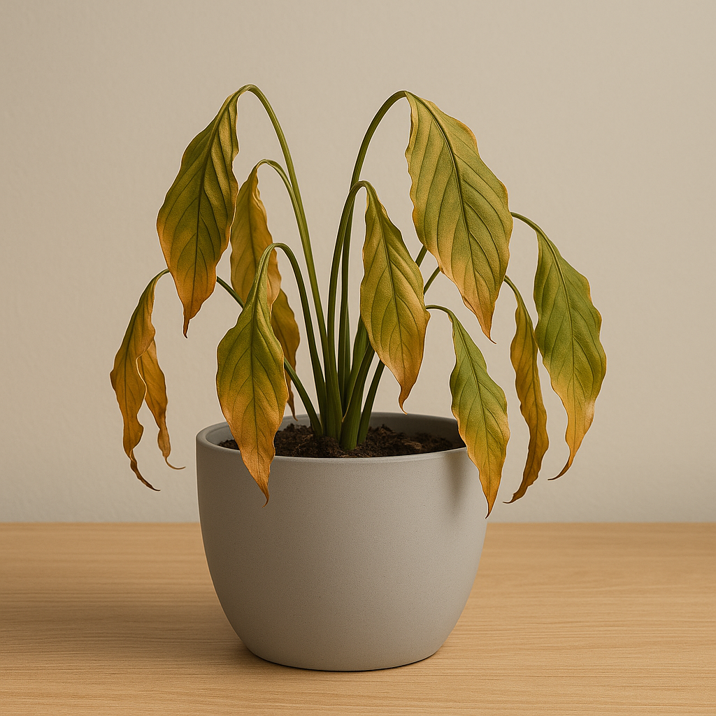 Thiếu nước là tình trạng thường gặp, đặc biệt vào mùa hè hoặc khi bạn quên tưới cây trong thời gian dài. Khi thiếu nước, lá cây sẽ bắt đầu héo rũ, mép lá có thể bị quăn lại, thậm chí chuyển sang màu vàng hoặc nâu khô. Nếu sờ vào lá, bạn có thể cảm thấy chúng giòn và dễ gãy. Đất trong chậu thường rất khô, có thể tách khỏi thành chậu và không còn độ ẩm để nuôi cây.