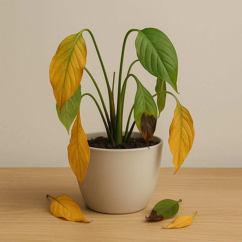 Ngược lại, khi cây nhận quá nhiều nước, lá cây cũng có thể vàng úa nhưng thường kèm theo tình trạng rụng nhiều, đặc biệt là lá non. Một số cây còn xuất hiện những đốm đen hoặc phần thân, rễ bị thối nhũn. Nếu bạn nhận thấy đất trong chậu lúc nào cũng ẩm ướt, có mùi hôi hoặc có rêu mốc trên bề mặt, đây là dấu hiệu rõ ràng cho thấy cây đã bị thừa nước.