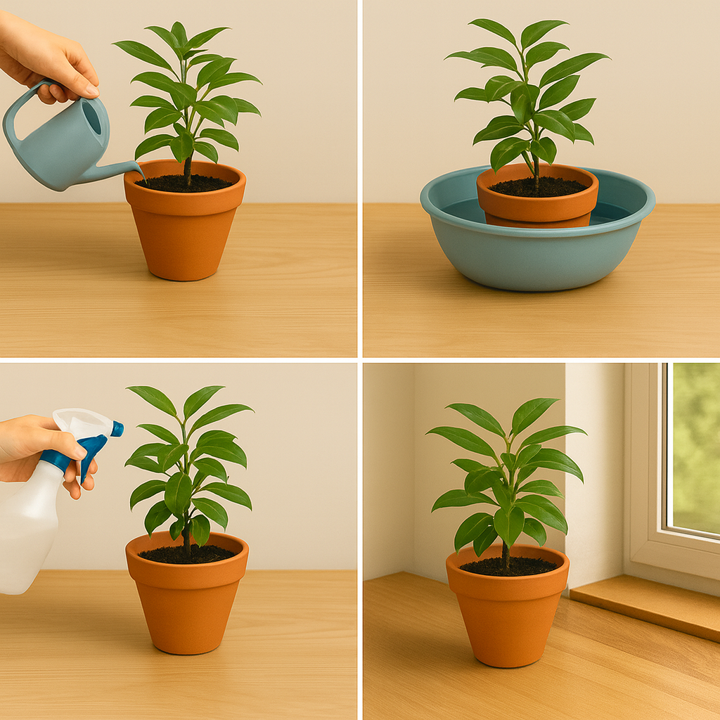 Ngoài ra, nếu không khí quá khô, đặc biệt là khi cây được đặt trong phòng điều hòa, bạn có thể xịt sương lên lá để tăng cường độ ẩm hoặc đặt một chậu nước gần cây để tạo môi trường. Nếu cây bị thiếu nước do ánh nắng quá gắt, hãy di chuyển cây đến nơi có bóng râm nhẹ để giảm bớt tác động từ nhiệt độ cao.