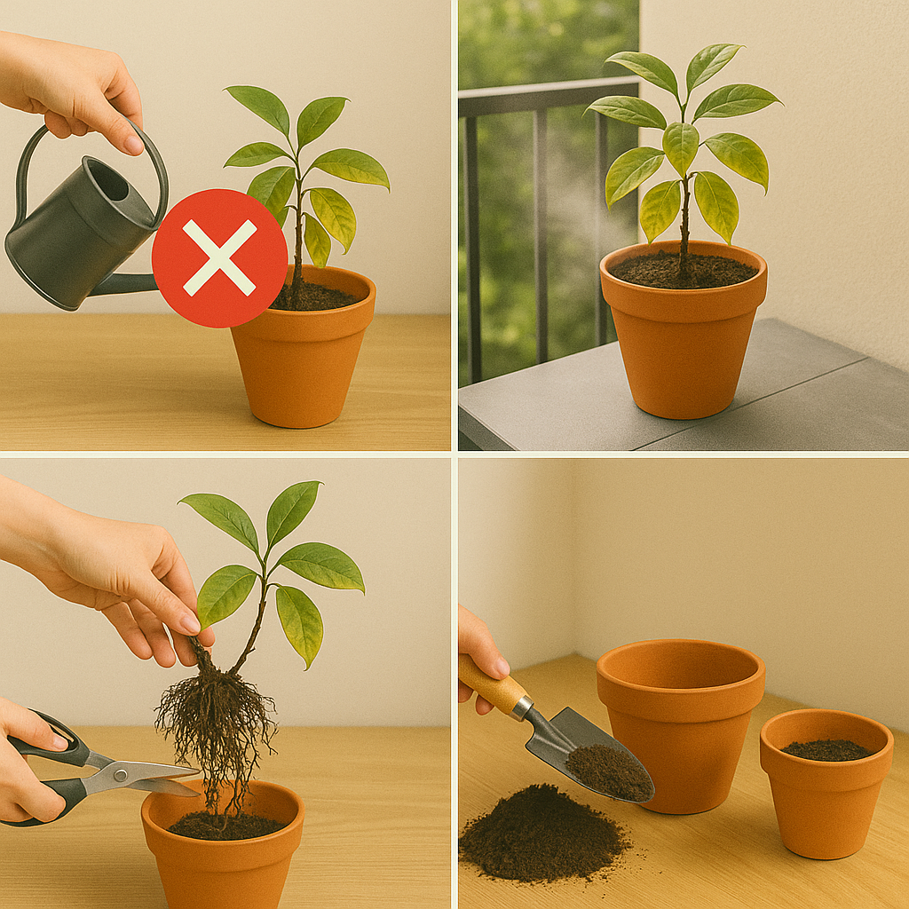 Sau khi trồng lại, đừng tưới nước ngay mà hãy để cây ở nơi thoáng mát trong khoảng 1-2 ngày để rễ có thời gian phục hồi. Khi bắt đầu tưới nước trở lại, hãy đảm bảo chỉ tưới khi bề mặt đất đã khô hoàn toàn và sử dụng chậu có lỗ thoát nước để tránh tình trạng ứ đọng nước trong tương lai.