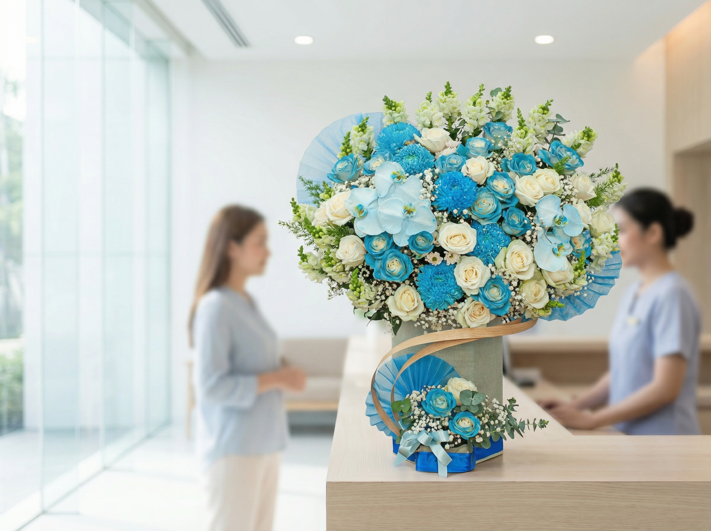 Các loại hoa như cẩm tú cầu xanh, hoa chuông xanh, hoa phi yến (delphinium), … Tông màu này đặc biệt thích hợp để tặng cho các bác sĩ trẻ, những người đang trên con đường sự nghiệp, hoặc trong bối cảnh bệnh viện, phòng khám.