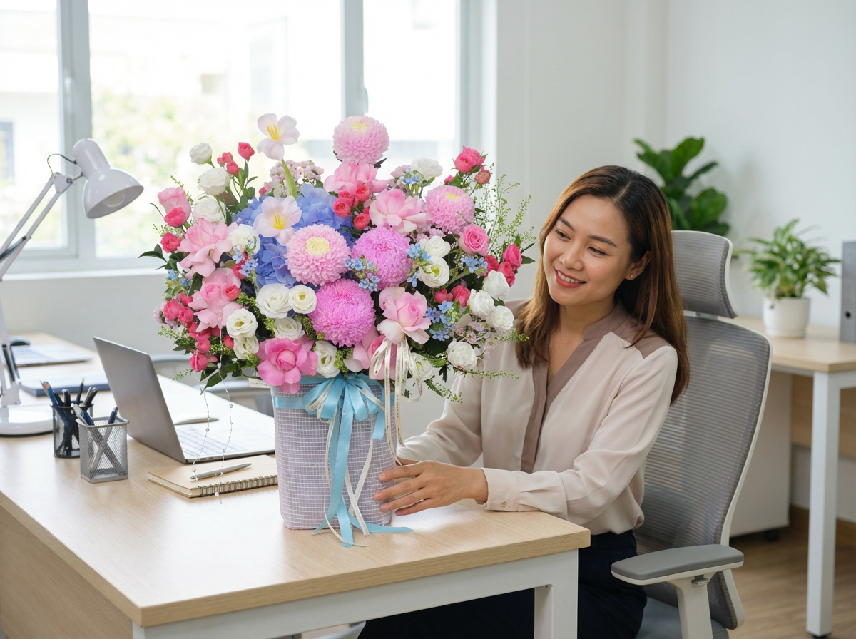 Bước 3: Xác định thời điểm và phương thức trao tặng tối ưu: Thời điểm lý tưởng nhất để giao hoa là vào ngày 8/3 hoặc chiều tối ngày 7/3, tạo sự bất ngờ cho người nhận khi bắt đầu ngày lễ. Phương thức giao hàng cũng cần được chú trọng: giao tận nơi đến văn phòng hoặc nhà riêng, với đội ngũ nhân viên giao hàng lịch sự, có đồng phục chỉn chu.